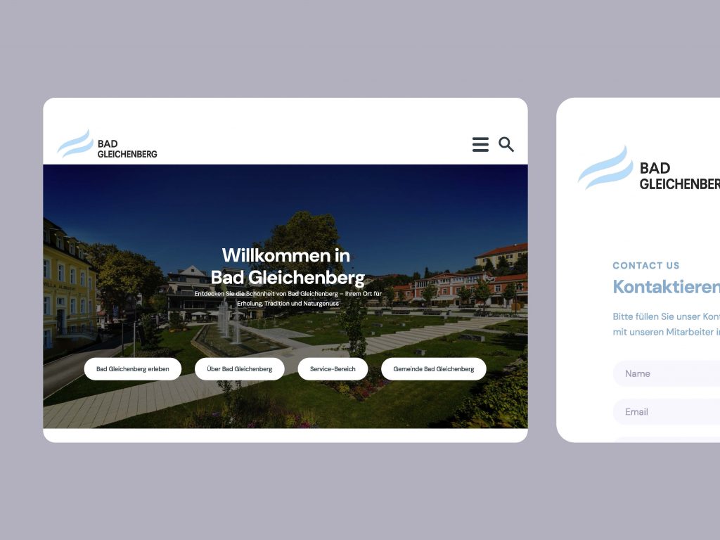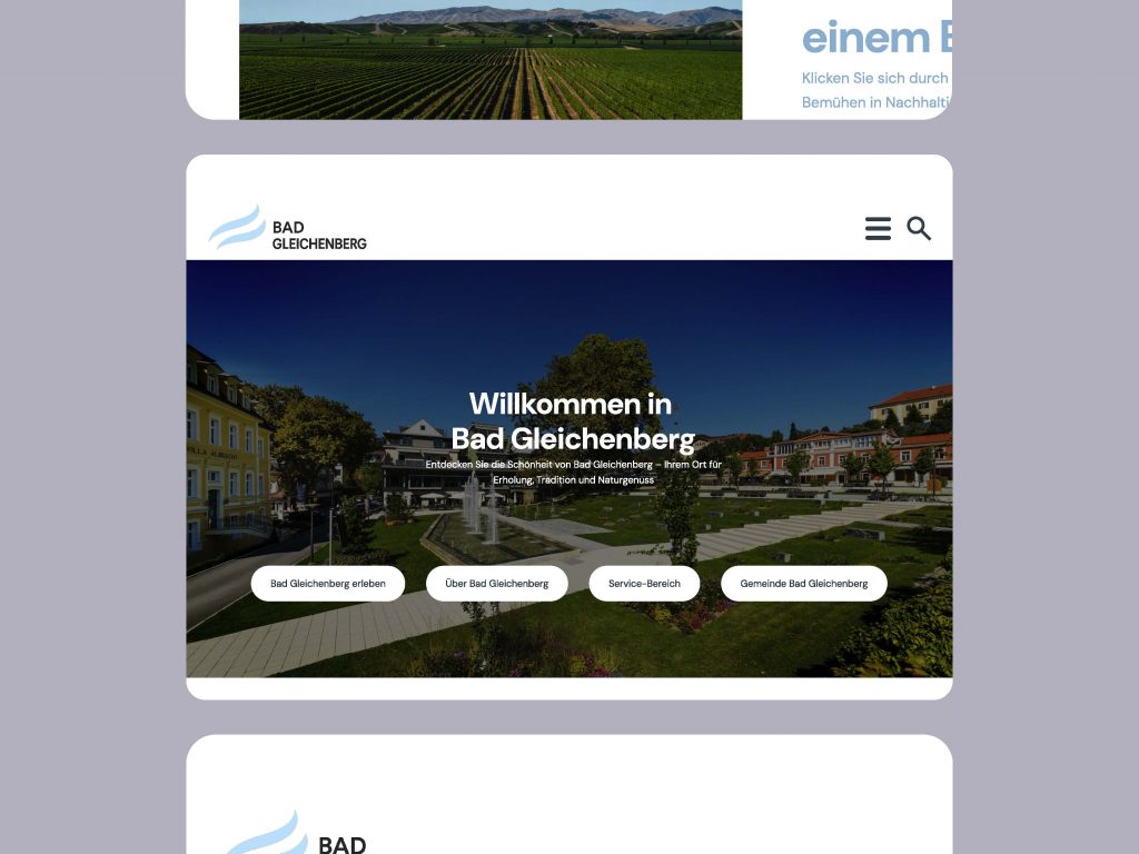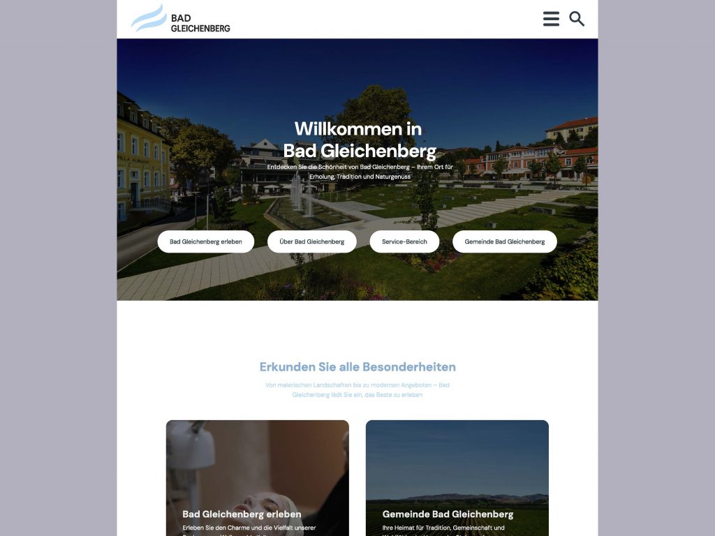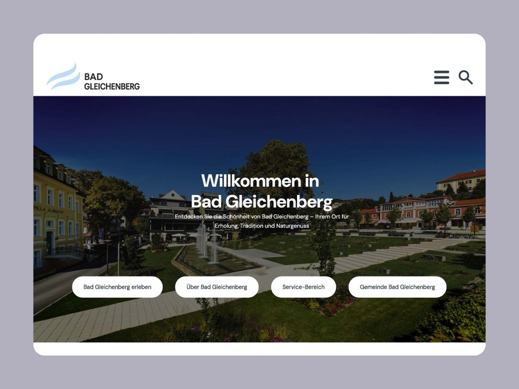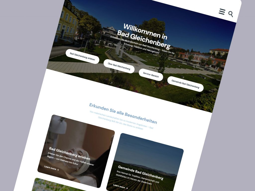 Für Bad Gleichenberg habe ich ein klares, bürgernahes Web-Design entwickelt: großzügige Hero-Fläche mit prägnanter Willkommensbotschaft, schnell zugängliche Hauptpfade (Erleben, Über die Gemeinde, Service, Verwaltung) und eine ruhige, gut lesbare Typografie. Abgerundete Card-Layouts und viel Weißraum schaffen Orientierung, während sanfte Blautöne das bestehende Erscheinungsbild modern interpretieren. Das Konzept ist mobile-first gedacht, barrierearm (klare Kontraste, große Touch-Targets) und in modulare Komponenten gegliedert, die Inhalte im CMS flexibel pflegbar machen. Ziel: Informationen schneller finden, Tourismus-Angebote hervorheben und zugleich den Servicebereich für Bürger*innen deutlich vereinfachen.